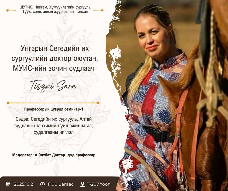 МУИС-ийн зочин судлаач Tiszai Sara нь ШУТИС, Нийгэм Хүмүүнлэгийн Сургуулийн Түүх, соёл, аялал жуулчлалын тэнхимээс зохион байгуулж буй “Профессорын цуврал семинар 1” үйл ажиллагаанд уригдан “Сегедийн их сургууль, Алтай судлалын тэнхимийн үйл ажиллагаа, судалгааны чиглэл”-ээр илтгэл тавьлаа.