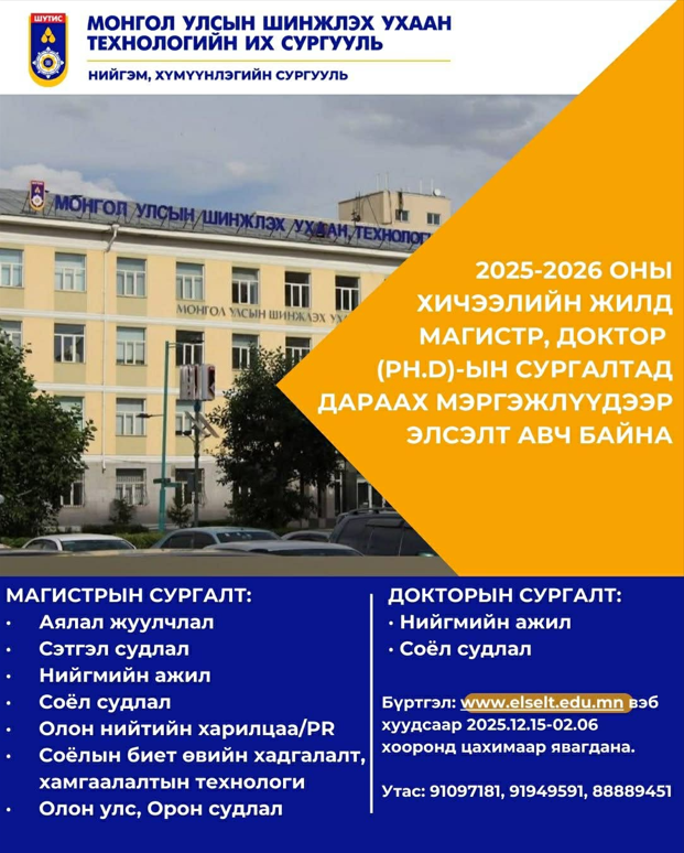 ШУТИС-ийн магистр, докторын элсэлт явагдаж байна.