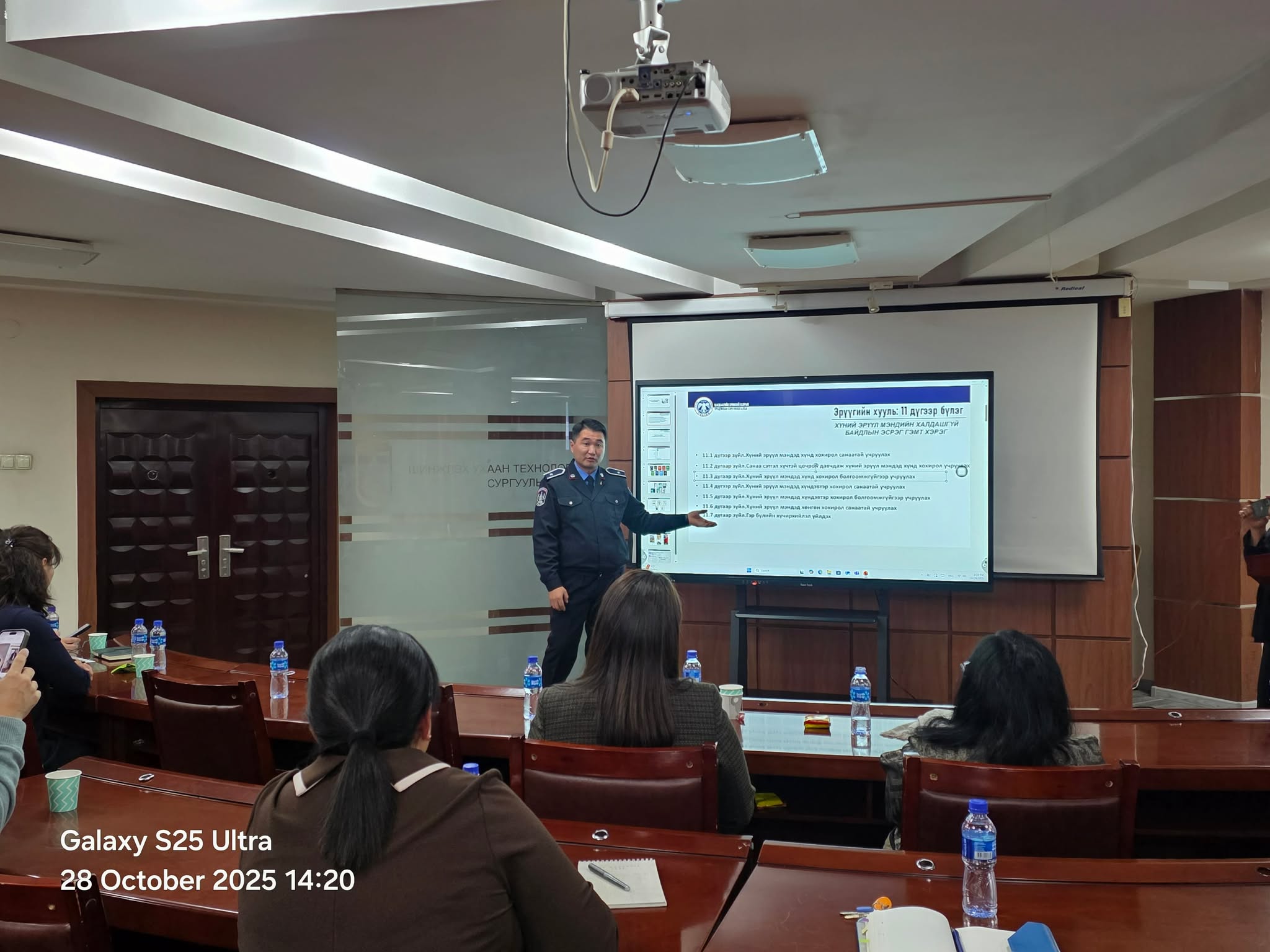 Иймээс НХС-ийн хүрээнд урьдчилан сэргийлэх чиглэлтэй сургалт, мэдээлэл, зөвлөгөөний ажлыг тогтмол зохион байгуулах шаардлагатай юм. Иймд 2025 оны 10-р сарын 28-ны өдөр НХС-ийн багш ажилчдын дунд гэмт хэргээс урьдчилан сэргийлэх сургалтыг зохион байгуулав. Тус сургалтыг “ГЭМТ ХЭРГЭЭС УРЬДЧИЛАН СЭРГИЙЛЭХ НЬ” нэртэйгээр ЦЕГ-ын Урьдчилан сэргийлэх газрын Гэмт хэрэг, зөрчлөөс урьдчилан сэргийлэх Хэлтсийн Урьдчилан сэргийлэх, Дүн шинжилгээний тасгийн дарга, цагдаагийн хошууч Б.Бадамхатан явууллаа.