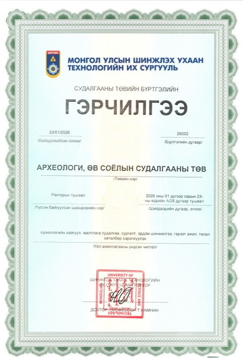 Монгол улсын Шинжлэх Ухаан Технологийн Их Сургуулийн Нийгэм, Хүмүүнлэгийн сургуулийн дэргэдэх “Археологи, Өв соёлын судалгааны төв”-нь ШУТИС-ийн ректорын 2026 оны 1 сарын 23-ны өдрийн А/28 дугаар тушаалаар байгуулагдан ажиллаж байна.